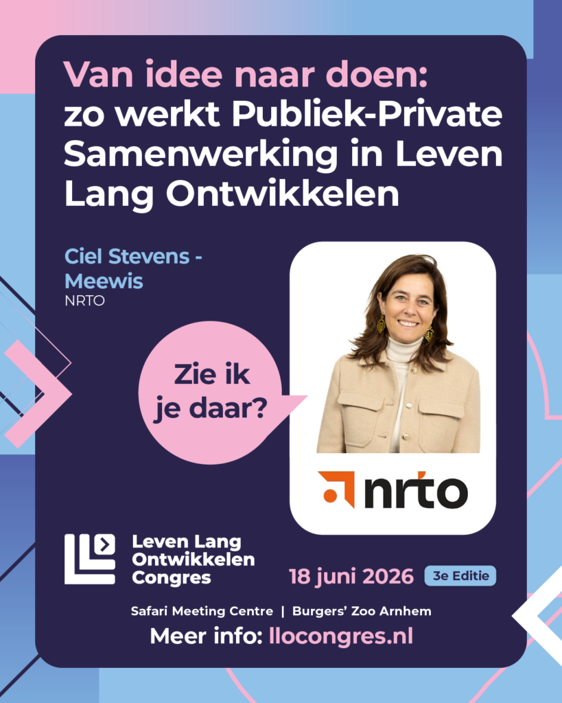 Op donderdag 18 juni 2026 vindt het even Lang Ontwikkelen Congres in Burgers’ Zoo (Arnhem) plaats. Dit is een congres met inspiratie voor onderwijs-, HR- en L&D- professionals over de toekomst van LLO. Dit jaar is NRTO-directeur Ciel Stevens weer aanwezig en ditmaal gaan we in een sessie dieper in op publiek-private samenwerking (Van idee naar doen: zo werkt Publiek-Private Samenwerking in Leven Lang Ontwikkelen). Lijkt het je interessant om erbij te zijn? Gebruik dan de NRTO-kortingscode CIEL10 voor 10% korting.